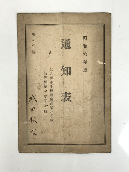 This vintage Japanese student record report card features grades, attendance records, and a health tracker. It is dated Showa 6 (1931) and belonged to an elementary school student from a school in Nagoya. The name of the owner, as well as red seals from the parents and the school, are on the card.