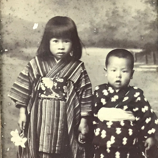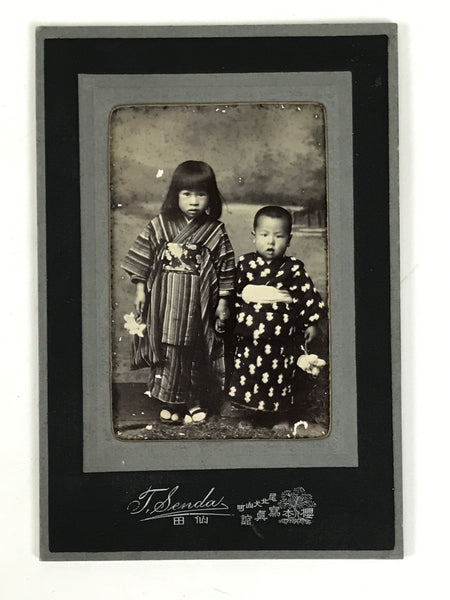 This is an antique Taisho Era black and white photograph of two young children. Both of the children appear to be under the age of four and wear very basic kimono (simple, flexible layers). It comes adhered to and frames in a thick card.