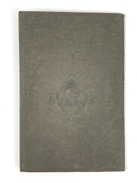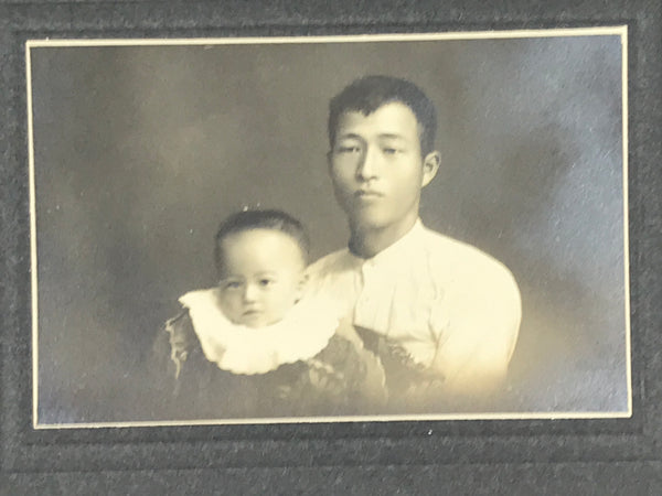 This is an antique Taisho Era black and white photograph of a father and baby. The father wears a simple white shirt while the baby wears a decorative silk top and soft frilled collar. It comes adhered to a thick card in a paper folding cover.