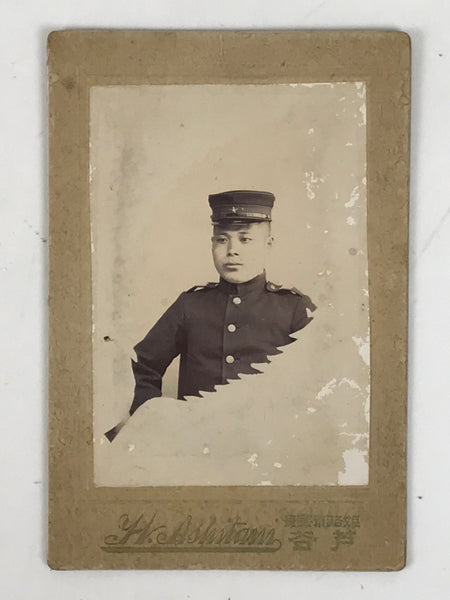 This is an antique Taisho Era young soldier portrait photograph in black and white. Often times portraits of soldiers were taken in full-dress before deployment as a keepsake for the family should they not return home. As many soldiers were conscripted straight out of school, and the greying of the line between school uniform and military uniform disappeared became obvious, this could also be a school/graduation portrait. It comes adhered to the original thick, decorative paper card.