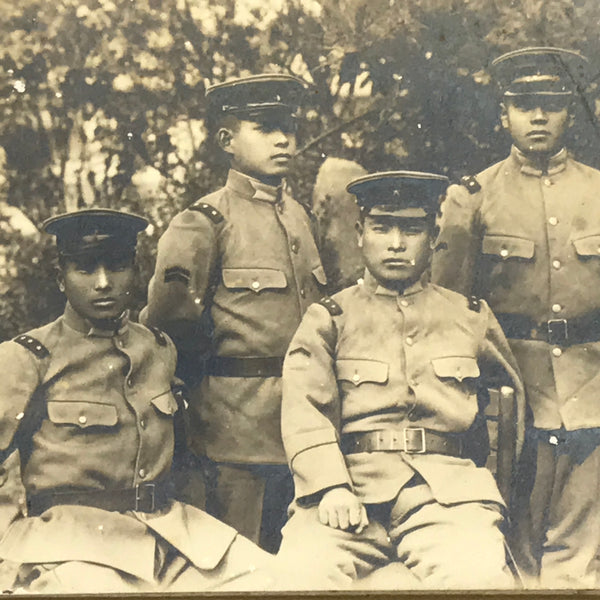 This is an antique Taisho Era soldier group portrait photograph in a soft sepia tone. Often times portraits of soldiers were taken in full-dress before deployment as a keepsake for the family should they not return home. These young men are likely friends. It comes adhered to the original thick, decorative paper card.