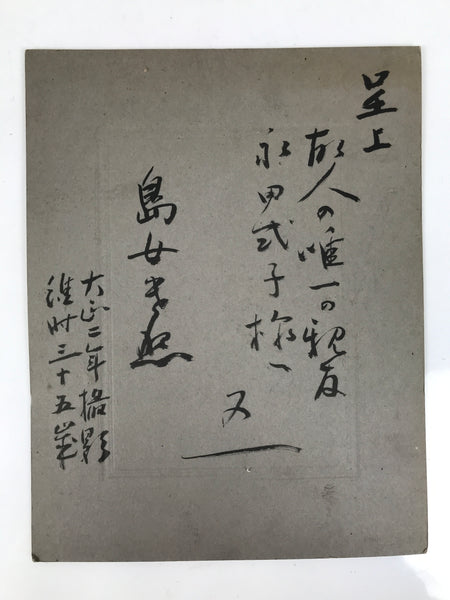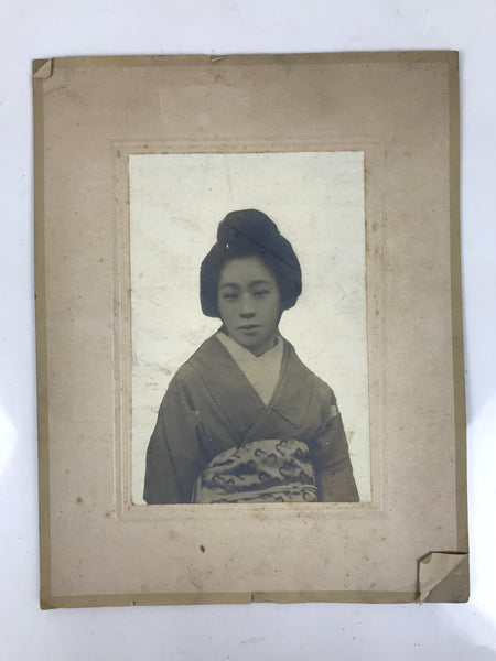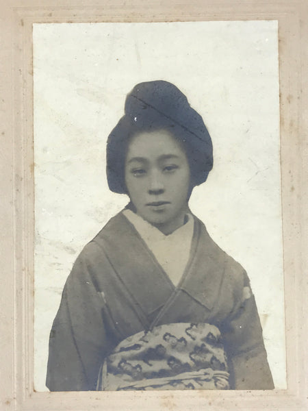 This is an original antique Taisho Era portrait photograph of a beautiful young woman in kimono. The text on the back that can be read as describing the person in the photo. It comes adhered to the original thick, decorative paper card and in the style of funeral photos often displayed during the memorial and prayer service.