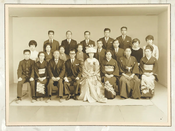 This is a vintage sepia tone wedding group photograph of a Japanese couple with family. The bride is wearing a traditional wedding-style kimono (uchikake), while the groom has opted for a suit with gloves. This photo comes stored in a gold paper folding cover with a large red kanji character (寿 kotobuki, which is congratulatory and means longevity) and red and white strings.