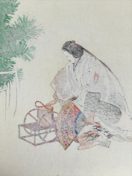 This vintage Japanese writing paper is a colorful woodblock-printed reproduction of an artwork by Kogyo Tsukioka representing a character from the Noh play "Matsukaze". The paper is folded in four.