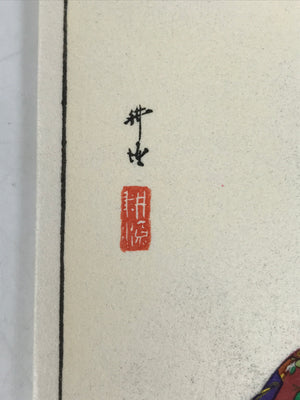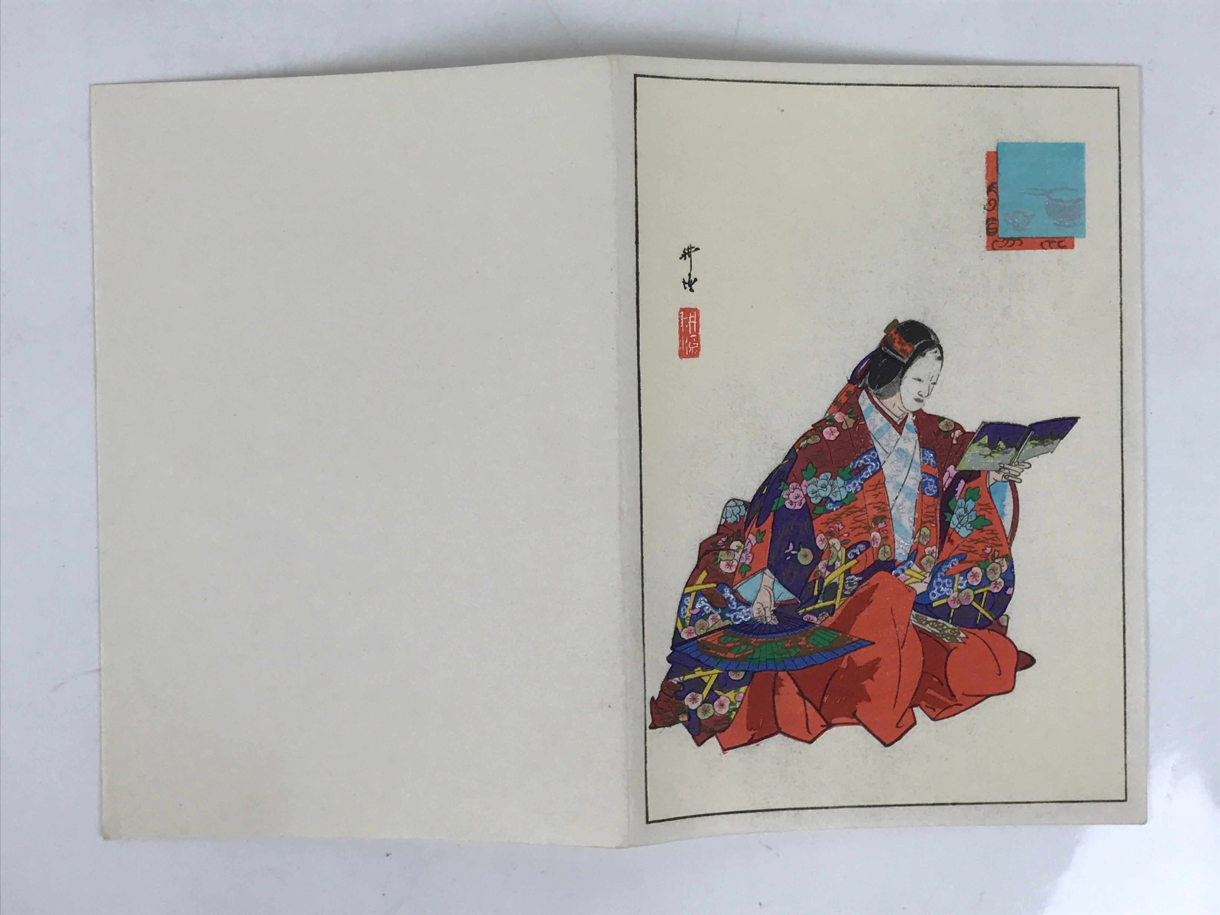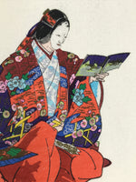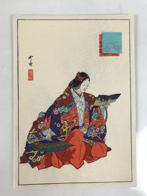 This vintage Japanese writing paper is a colorful woodblock-printed reproduction of an artwork by Kogyo Tsukioka representing a character from the Noh play "Soshi Arai Komachi". The paper is folded in four.