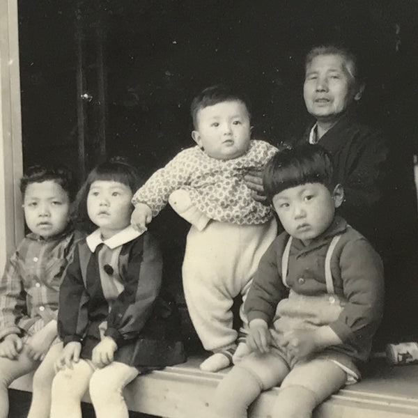 This is an original vintage Showa-era black and white portrait photograph of young children (likely siblings and cousins) sitting with their grandfather.