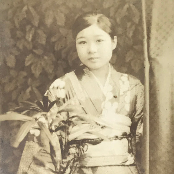 This is a Japanese vintage sepia tone portrait photograph of a young woman taken during the Showa era. She poses between a potted plant and a curtain and wears a beautifully patterned kimono. She appears to be in her teens.