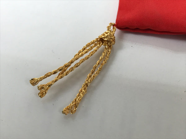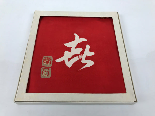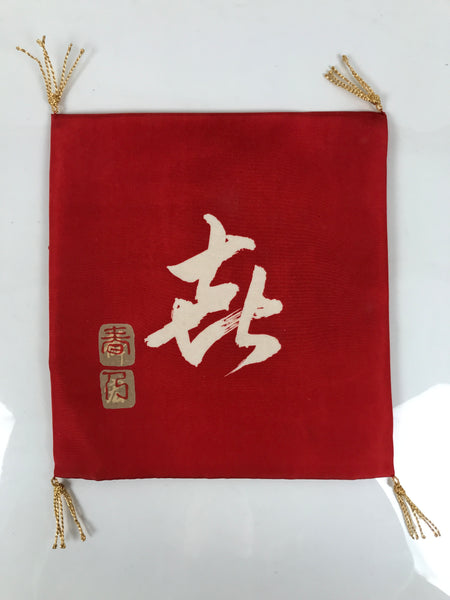 This is a Japanese vintage silk cover for gift envelopes (Kinpu Fukusa) given at weddings or funerals. This cover features calligraphy of the character kotobuki (congratulations, prosperity, etc). This red-and-white cover is square and has four golden tassels on the corners. It can be folded as desired. The back of the cover is red. It comes in a paper box.