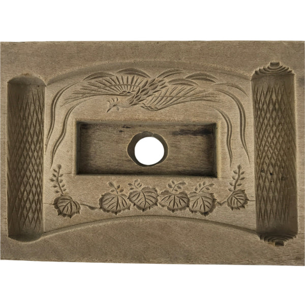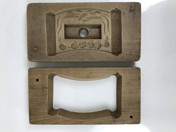 This two-panel kashigata mold is carved with the design of a scroll-like frame with a phoenix (Ho-oh) and flowers with leaves. There is an empty spot at the center to place a smaller text kashigata piece (not included). This mold can be used to make sweets or as an eye-catching decorative item.