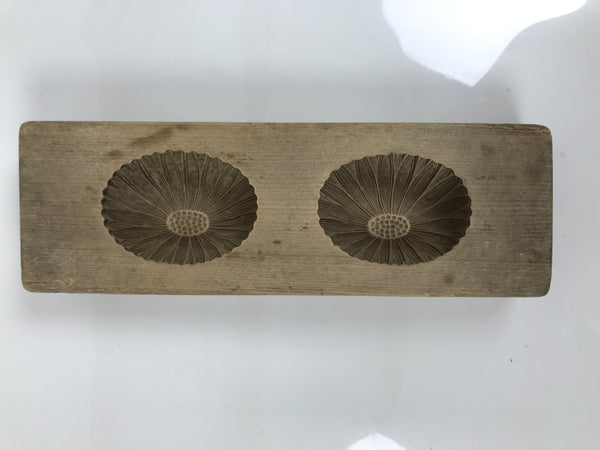 This two-panel kashigata mold is carved with the design of two large, detailed chrysanthemum flowers (kiku). This mold can be used to make sweets or as an eye-catching decorative item.