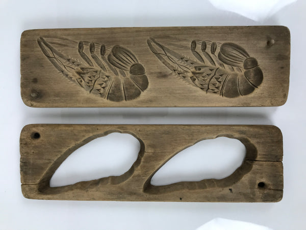 This two-panel kashigata mold is carved with the design of two large, curled shrimp (ebi). This mold can be used to make sweets or as an eye-catching decorative item.