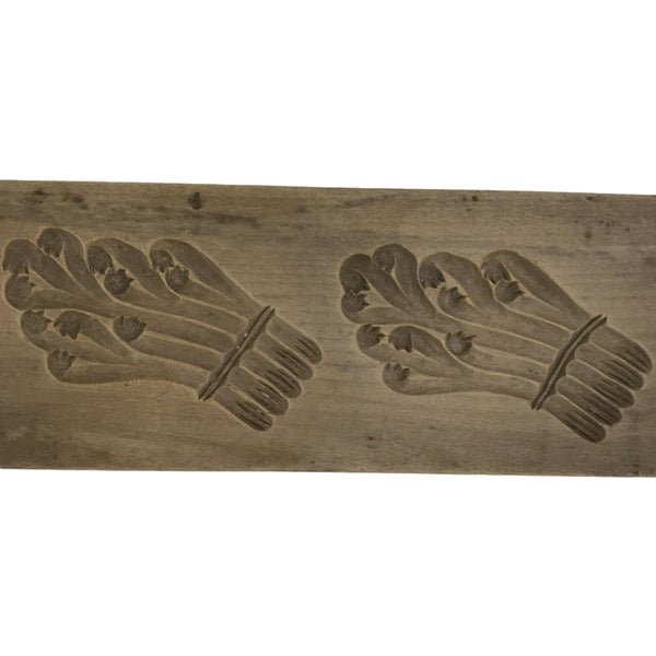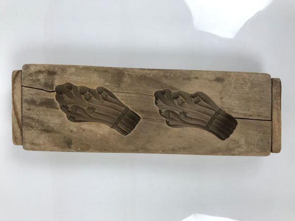 This two-panel kashigata mold is carved with the design of two bundles of bracken fern (warabi). Warabi is most commonly known for warabi mochi, a gelatinous type of mochi often covered with toasted soy bean powder (kinako)