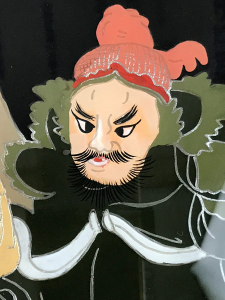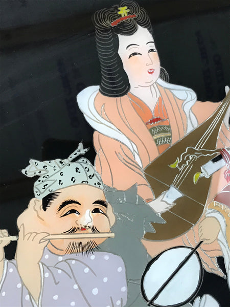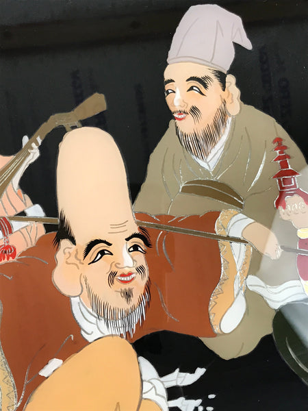 In a black and copper wood frame with a glass panel, this enamel portrait of the Seven Lucky Gods features Ebisu, Benten, Bishamon, Hotei, Daikoku, Fukurokuju, and Jurojin. The Gods have happy faces and are playing music and dancing. The Gods are painted in desaturated colors such as green, dark green, light orange and gray, and the background is black. The frame has an attached string at the back. It is a gorgeous elegant piece to use in home and office decor.