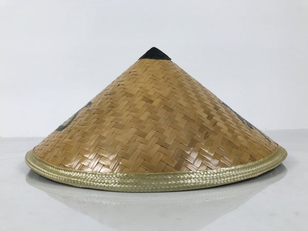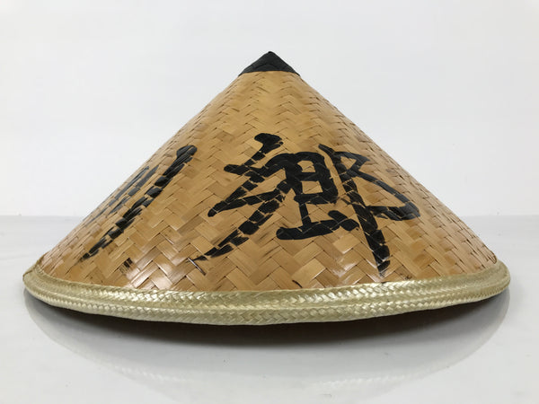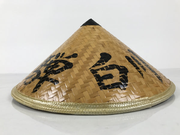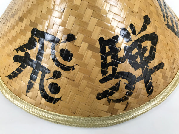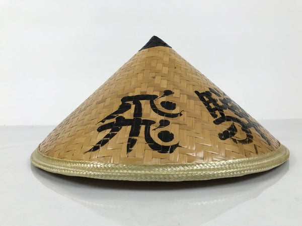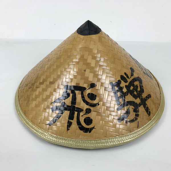 This is a vintage Japanese bamboo leaf Kasa (or Sugegasa) hat. It has Japanese characters painted on the top and a net on the inside to facilitate attachment to the head. Pilgrims traditionally wear this hat for protection from direct sunlight or rain and snow. It is also used as a prop in Japanese dance and is a perfect decorative item.