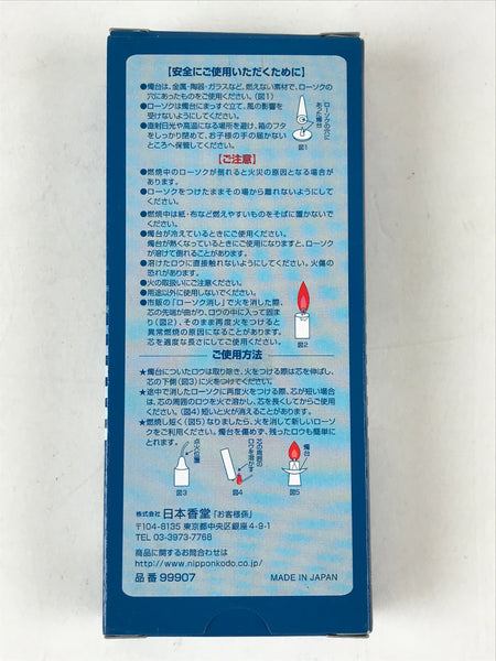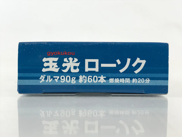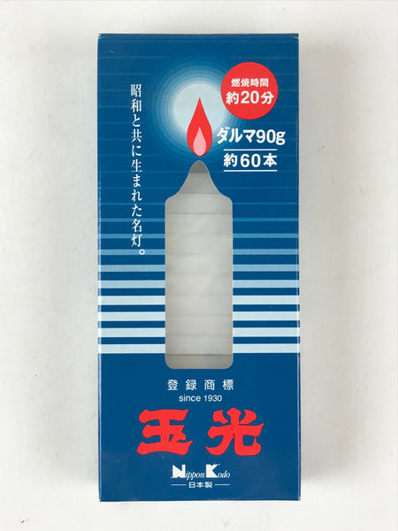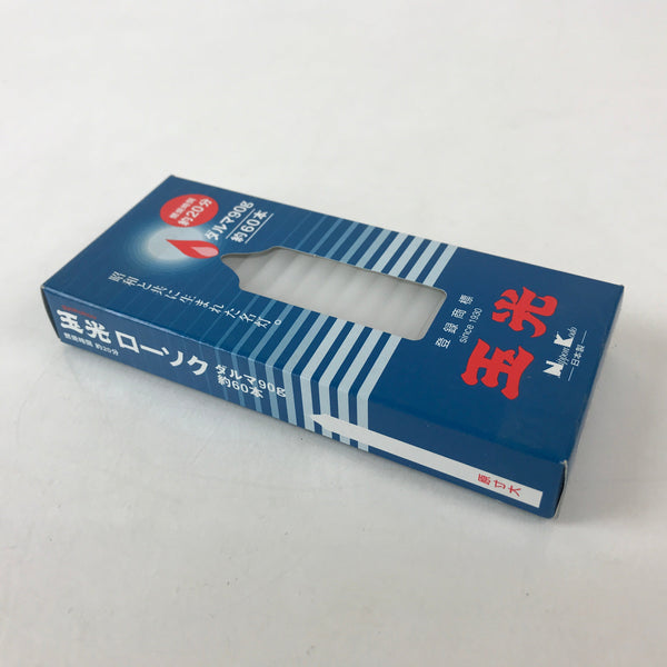 This is a vintage Japanese Buddhist altar-fitting, Candle set. There are 60 candles about 6 centimeters in length. The lid says 20 minutes burning time, Daruma 90g, Gyokukou, Nihon Kodo. Lighted candles offer prayers to the Buddha, ancestors, and the deceased at the Buddhist altar. In Buddhism, lighting a candle means that light is wisdom, and a candle means that all life will eventually come to an end.