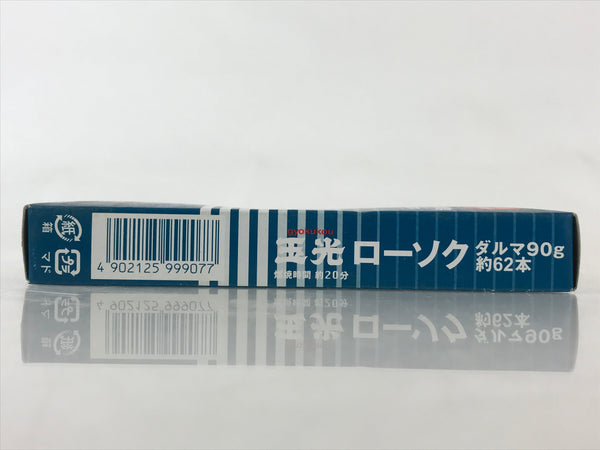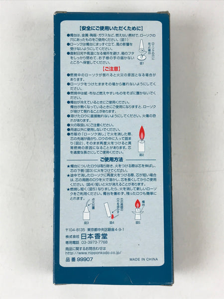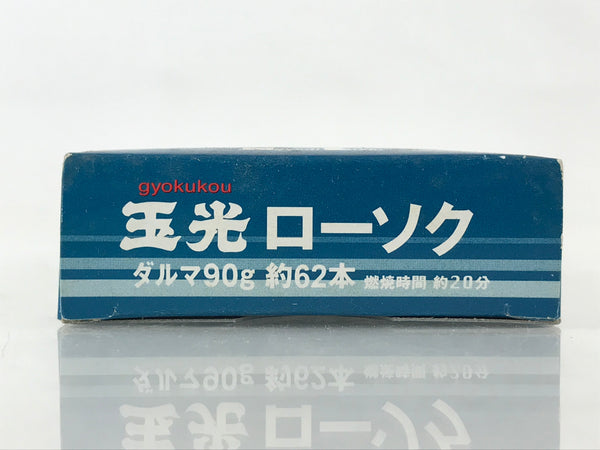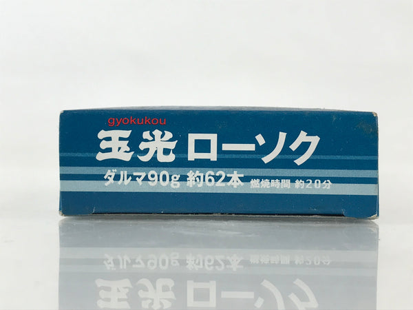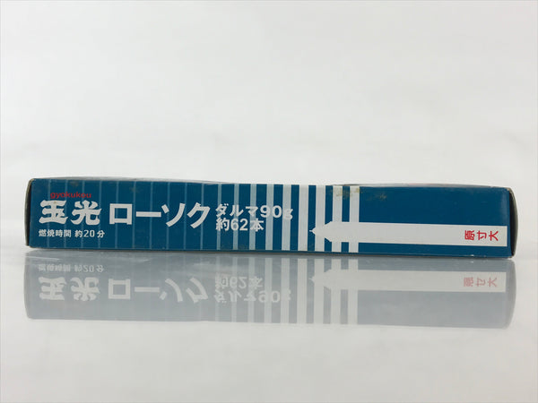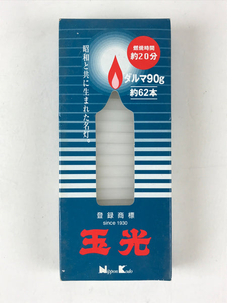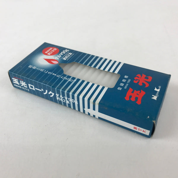 This is a vintage Japanese Buddhist altar-fitting, Candle set. There are 62 candles about 6 centimeters in length. The lid says 20 minutes burning time, Daruma 90g, Gyokukou, Nihon Kodo. Lighted candles offer prayers to the Buddha, ancestors, and the deceased at the Buddhist altar. In Buddhism, lighting a candle means that light is wisdom, and a candle means that all life will eventually come to an end.
