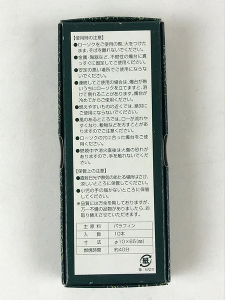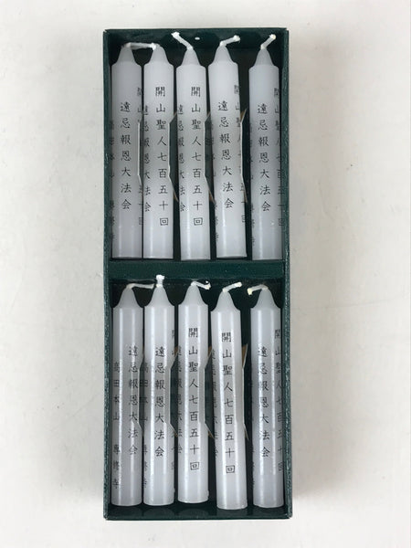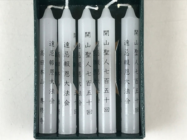 This is a vintage Japanese Buddhist altar-fitting, Candle set. A white candle with Kanji written as "The 750th Memorial Service, Takadahonzan, Senshuji temple" (開山聖人750回遠忌報恩大法会). There are 10 candles about 6.5 centimeters in length. The lid says Akari. Burning time is about 40 minutes. Lighted candles offer prayers to the Buddha, ancestors, and the deceased at the Buddhist altar. In Buddhism, lighting a candle means that light is wisdom, and a candle means that all life will eventually come to an end.
