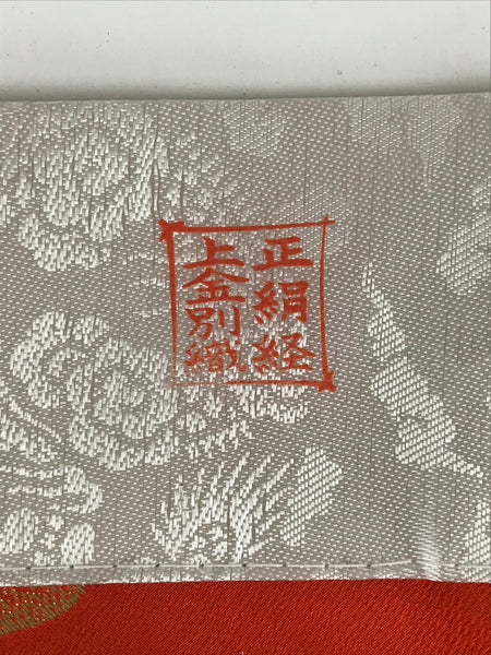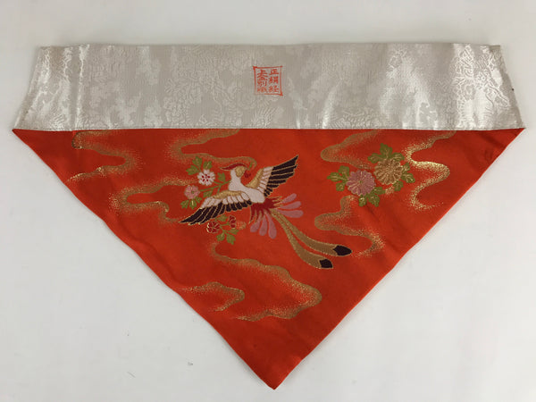 This is a vintage Japanese Buddhist altar tablecloth Uchishiki. This is gold phoenix embroidery on an orange background. It has a kanji stamp that says "Silk, Jogane weaving". Triangular uchishiki is mainly used by followers of Jodo Shinshu Buddhism as the upper table (Maejyoku) and the front table (Uwajyoku) in the Buddhist altar during events such as New Year's Day, the equinoctial week, Obon, and memorial services.
