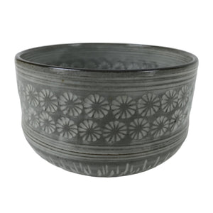 This is a vintage Japanese ceramic green tea bowl or matcha chawan. This piece is banko ware, or banko-yaki. It has high sides and features a medium gray and white banded design of small chrysanthemum flowers with one larger on at the inside bottom.