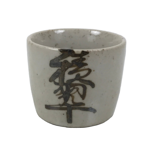 This is a vintage Japanese ceramic sake cup. This particular type of cup is half-cylindrical and off-white with brown kanji characters. In terms of size, it is also called ochoko, a good size for one sip of sake.