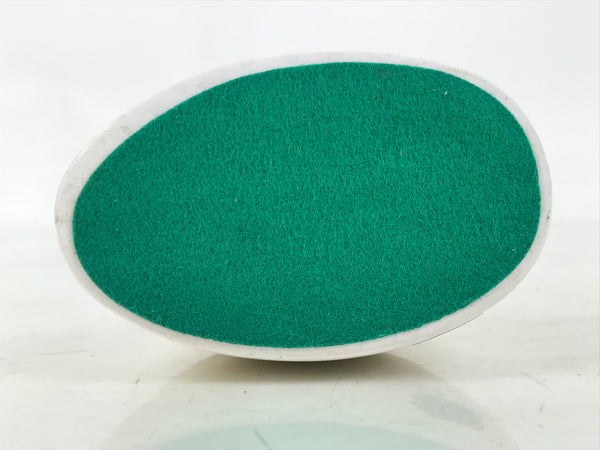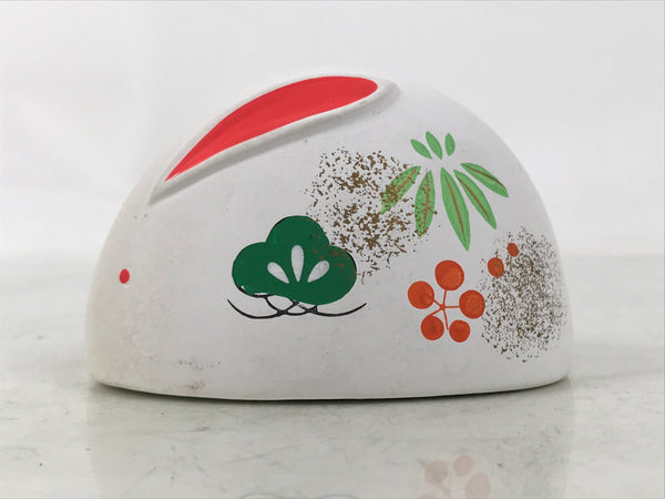 This is a vintage Japanese clay figurine of a rabbit. It is lightweight and is painted a matte white color. There is a painted shochikubai design (pine, bamboo, plum blossom) on one side with gold accents and pink ears. It has a felt pad on the bottom to protect surfaces.