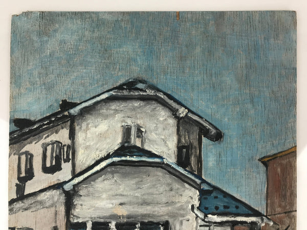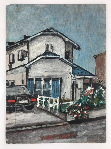 This original acrylic painting on wood features a modern Japanese home in a sprawling suburban neighborhood. While mostly cool and greyish tones, the pops of red and bright green add a lively element to the image overall. This piece is signed by Yasui Tazuru, but was part of a personal collection via the Japanese artist Yoshihiro Hagino.