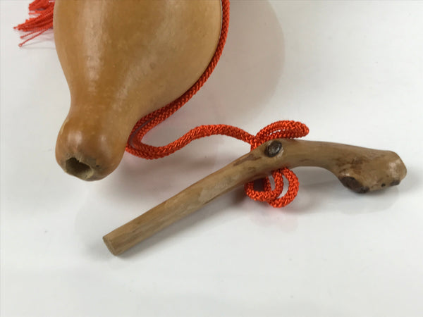 This Japanese naturally dried large hyotan gourd was not only made for storing and carrying sake and seeds but also as a good luck charm for display. It features a classic light brown color and individual curvy shape with an etched design of Benzaiten, one of the Seven Lucky Gods (shichifukujin). Benzaiten is the only goddess among the lucky gods and gives blessings of music, speech, literature, and knowledge. She is often depicted holding a Biwa lute. It has an orange silk braided cord with tassels tied around the lid and center. It has a lid in the form of a brushed lacquered piece of a tree branch. There are small stones inside to keep the gourd standing for display, however, they can be removed by request for cheaper shipping.