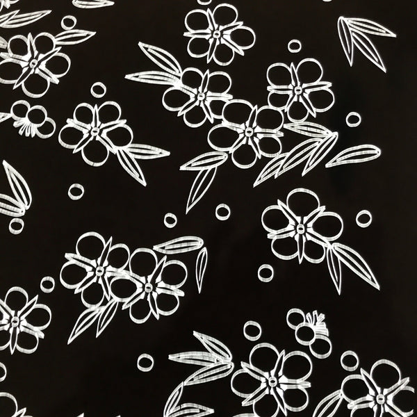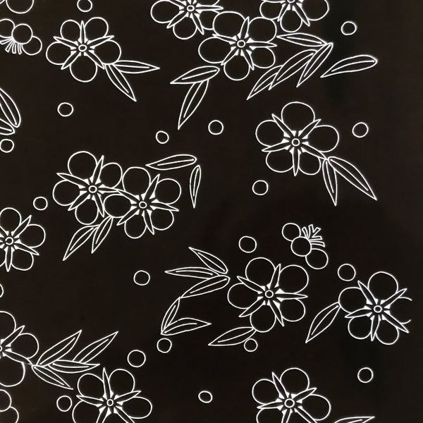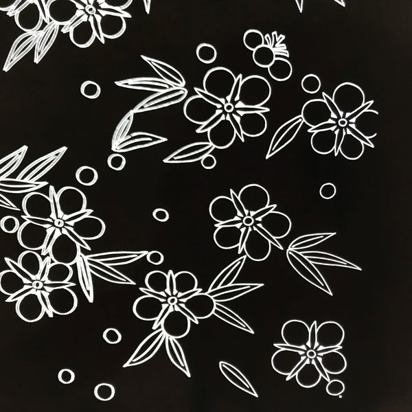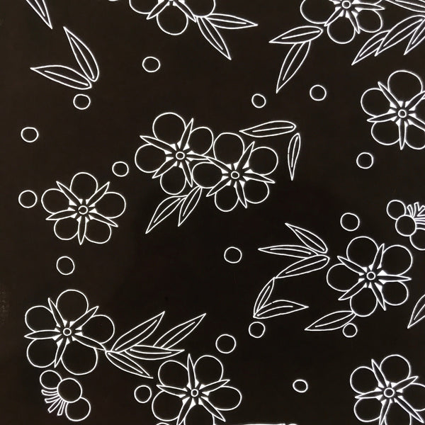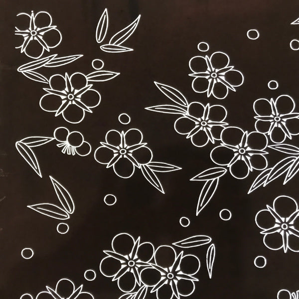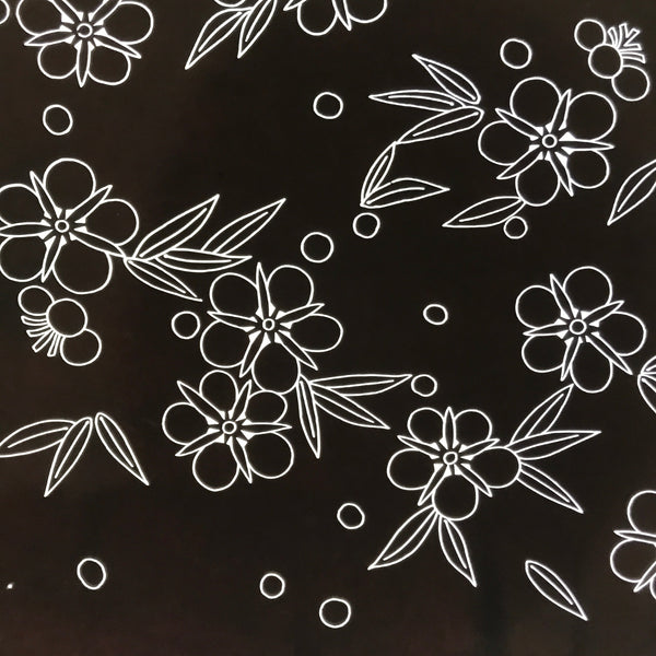 Using traditional mulberry paper, this katagami stencil with silk mesh backing features a  clear design of plum blossoms with leaves.