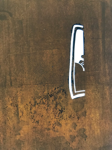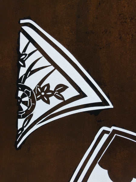 This antique Katagami was designed during the mid or late Edo period (1860) to early Meiji (1900) in Central Japan. It is made of two or more layers of handmade mulberry paper laminated together and waterproofed with persimmon tannin. Katagami printing uses a technique called resist dye where a paste is applied to the fabric with the katagami before dipping in ink. The open space on the katagami will be a negative space in the printed design.