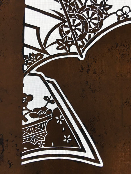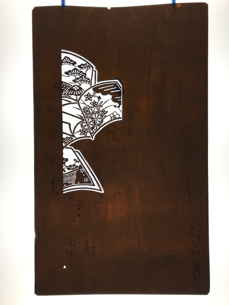 This antique Katagami was designed during the mid or late Edo period (1860) to early Meiji (1900) in Central Japan. It is made of two or more layers of handmade mulberry paper laminated together and waterproofed with persimmon tannin. Katagami printing uses a technique called resist dye where a paste is applied to the fabric with the katagami before dipping in ink. The open space on the katagami will be a negative space in the printed design.