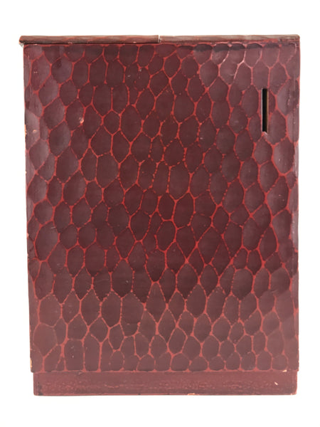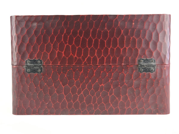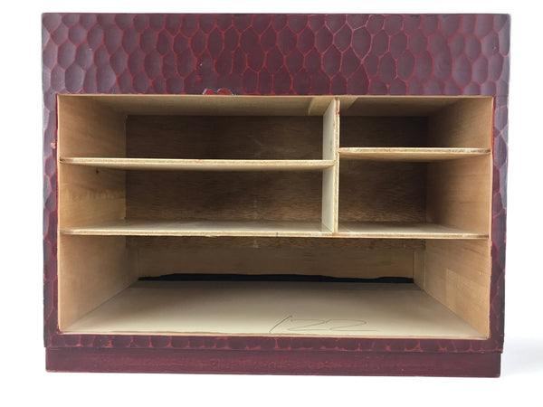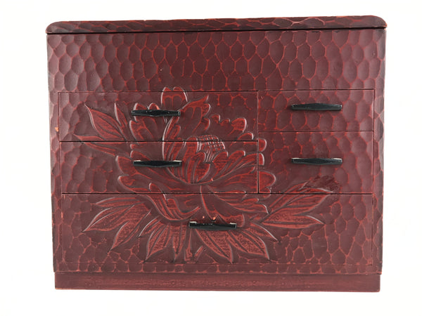 This is a Japanese sewing box, also called Haribako. Lacquered with a striking deep red color, it is decorated with a bold handcarved peony as well as a scaly/hammered design. This tansu chest has five differently-sized drawers with simple metal hardware. A panel in the lid opens to reveal a narrow tray that is removable with a secret compartment behind it. There is also a slot on the side that a small ruler can fit into. This beautiful piece can also be used for storing sewing supplies, jewelry, or other trinkets.