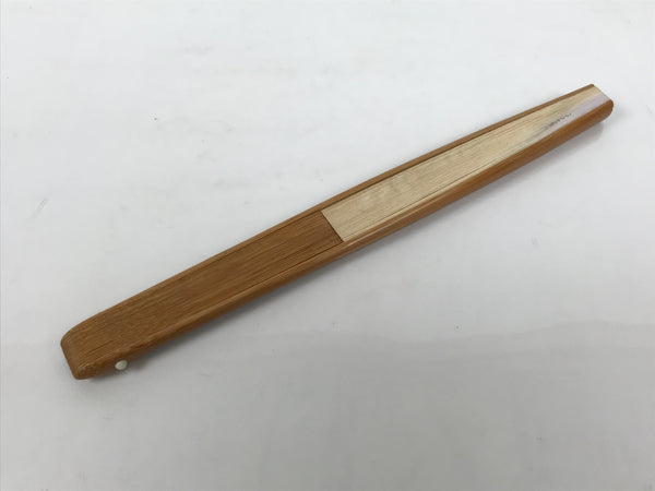 This is a traditional Japanese folding fan called sensu. You can use this when it's hot or as decoration. This fan is made with a natural bamboo frame and sturdy washi paper. It features a hatch mark design on one side over a beige background, while the back side is mostly beige with a purple accent near the top and a diamond-shaped design. There are some small kanji characters on one side.