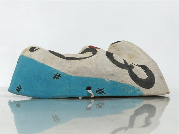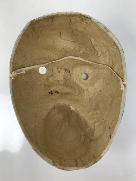 This is a vintage Japanese paper mache noh mask (noh-men). It features the face of a man named Hyottoko, who has a twisted, puckered mouth off to one side and a scarf tied around his head. Hyottoko is said to be a comical character and is often paired with Okame, the female equivalent. In many performances, Hyottoko plays the role of a clown. The mask can be used for all kinds of home and office decor.