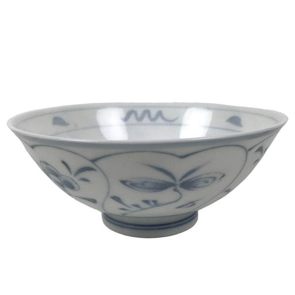 This item is a vintage Japanese Mino Ware porcelain rice bowl. This wide-mouthed small bowl is white with a blue design commonly known as "Shepard's Purse" that contains leaves, vines, and clusters of seeds. It can also be used for side dishes or as a chawan for drinking tea. Rice bowls are made to be lightweight and held in one hand (thumb on rim, other fingers on foot).
