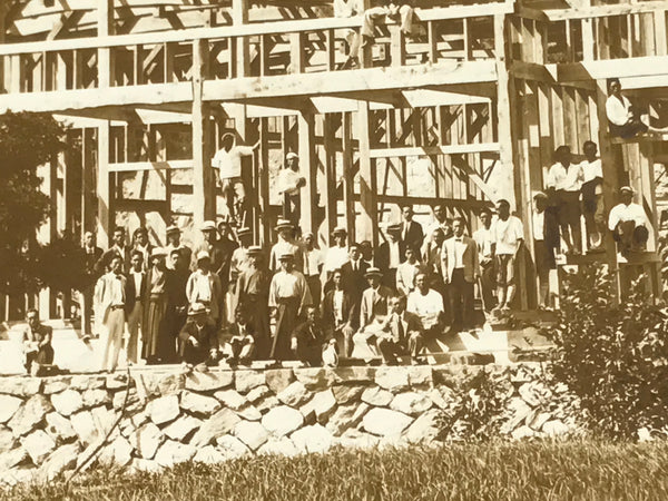 This is an original vintage early Showa Era daily life photograph of a traditional wooden frame home being built. It is a progress photo taken with the builders just before the next stage of construction.