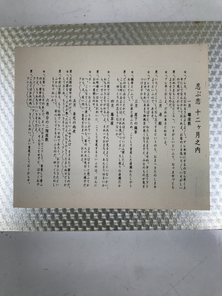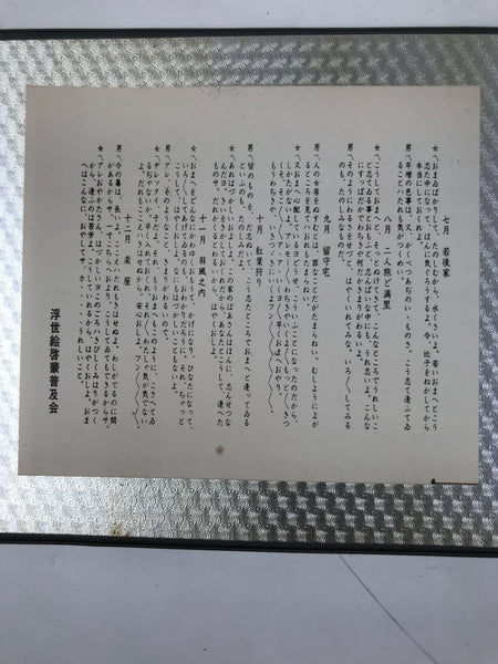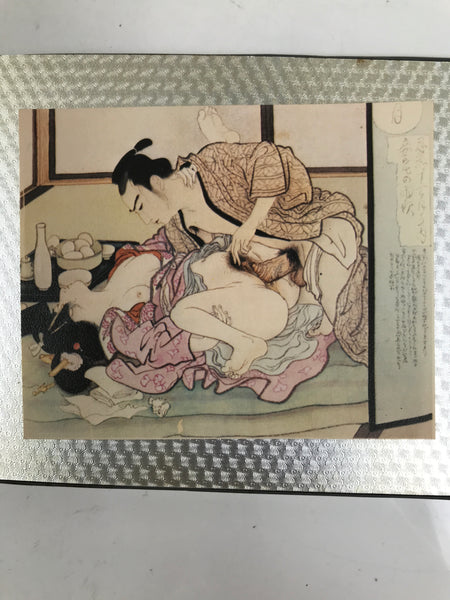 This is an album of Japanese vintage reproductions of a ukiyoe shunga woodblock print. It contains twelve shunga and dialogues between the couple in each shunga at the end.