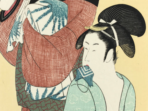 This is one of the 30 selections of vintage Utamaro Ukiyo-e woodblock printing published by Yuyudo. The title of the print is "娘日時計 午ノ刻" Women who took a bath at noon. Kitagawa Utamaro was a Japanese artist. He is one of the most highly regarded designers of ukiyo-e woodblock prints and paintings and is best known for his "Bijin ōkubi-e, large-headed pictures of beautiful women" of the 1790s. He also produced illustrated books on insects.