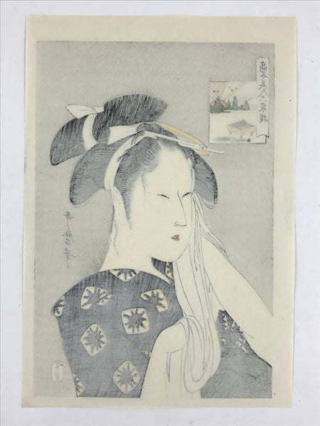 This is one of the 30 selections of vintage Utamaro Ukiyo-e woodblock printing published by Yuyudo. The title of the print is "高名美人六家撰 日の出家後家" After taking a bath. Kitagawa Utamaro was a Japanese artist. He is one of the most highly regarded designers of ukiyo-e woodblock prints and paintings and is best known for his "Bijin ōkubi-e, large-headed pictures of beautiful women" of the 1790s. He also produced illustrated books on insects.