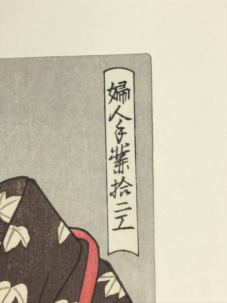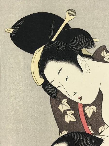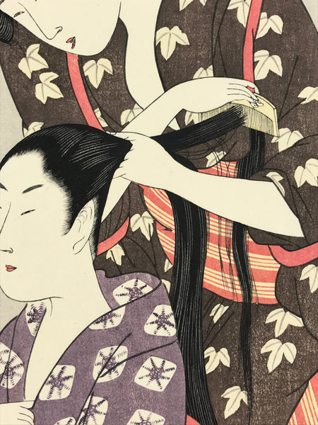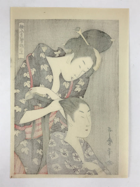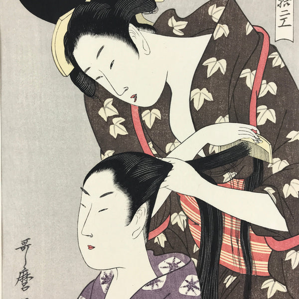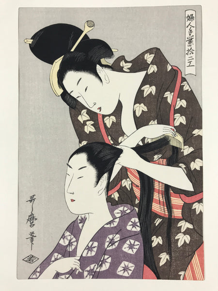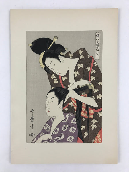 This is one of the 30 selections of vintage Utamaro Ukiyo-e woodblock printing published by Yuyudo. The title of the print is "婦人手業拾二工 髪ゆい" Lady ties up hair. Kitagawa Utamaro was a Japanese artist. He is one of the most highly regarded designers of ukiyo-e woodblock prints and paintings and is best known for his "Bijin ōkubi-e, large-headed pictures of beautiful women" of the 1790s. He also produced illustrated books on insects.