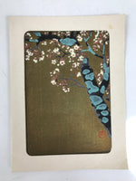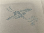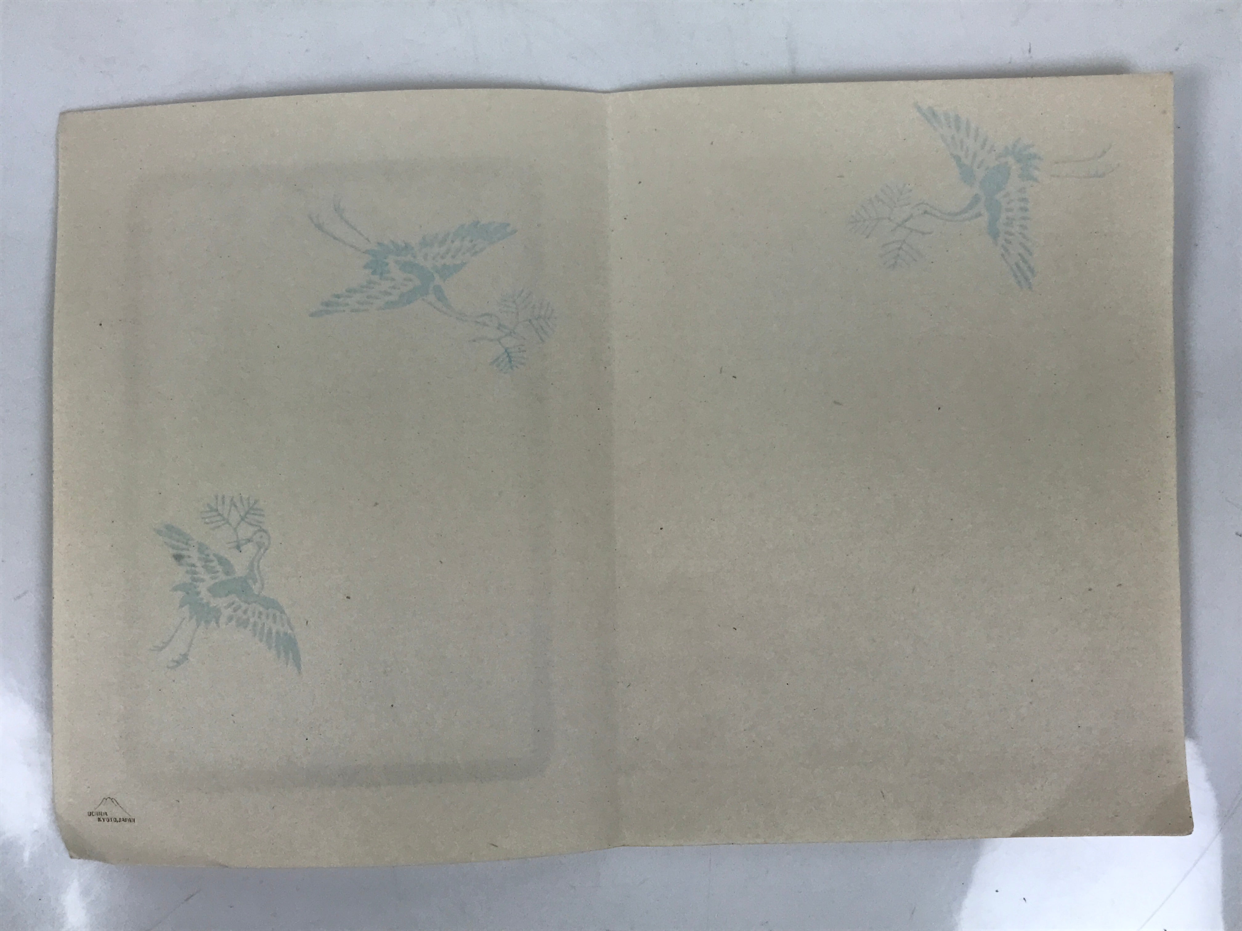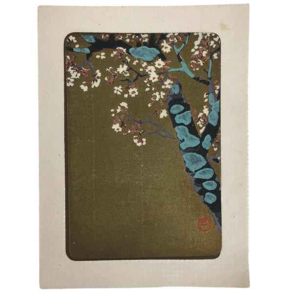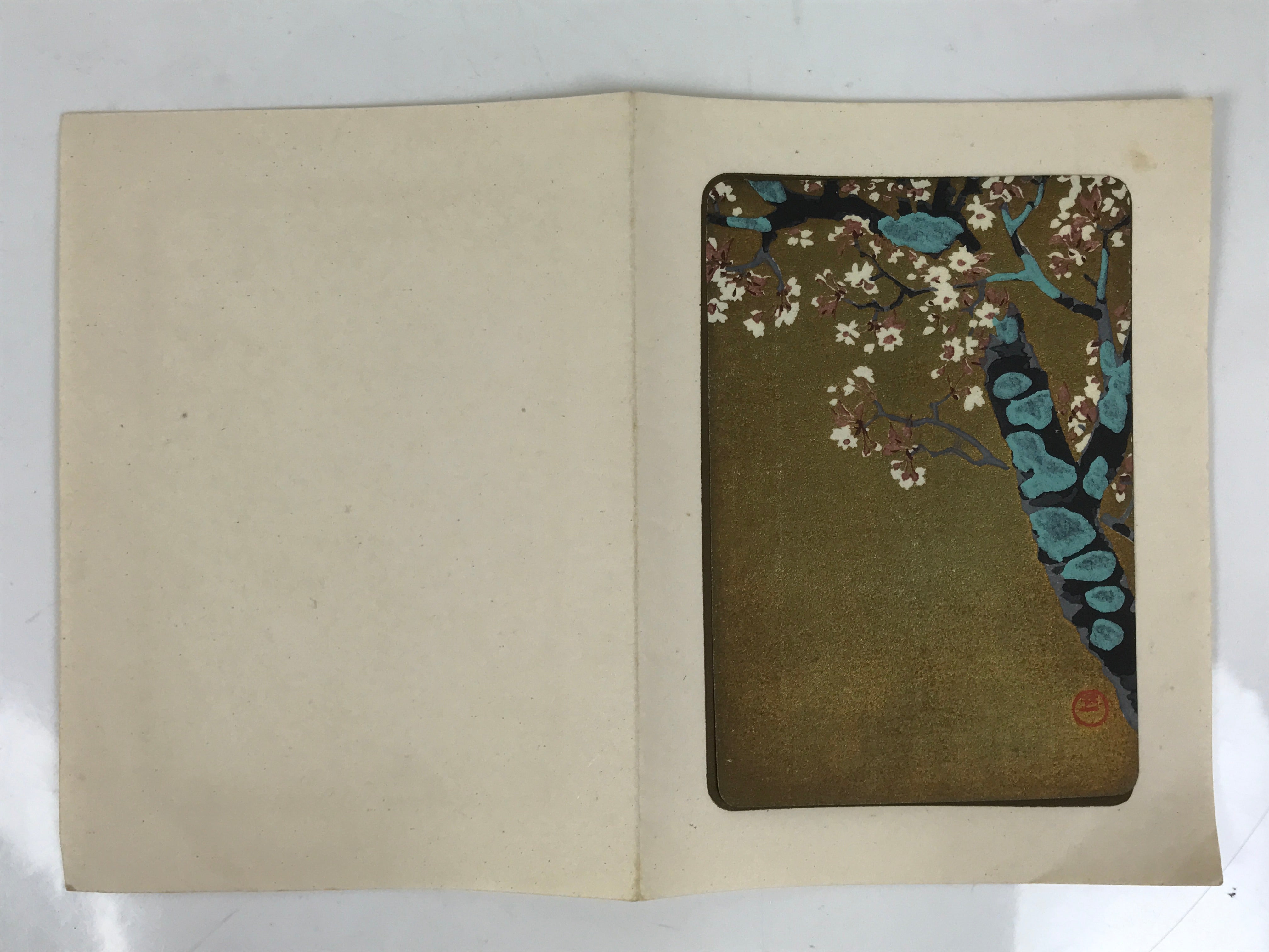 This vintage Japanese writing card features colorful woodblock-printed artwork representing a Japanese cherry tree with blossoms on a gold plain background. The artwork can be removed from the paper card. The inside of the card has light blue cranes printed on it. The card paper is folded in four.