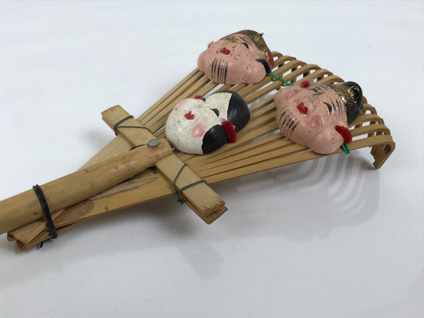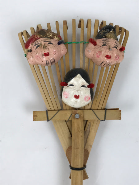 This vintage Japanese bamboo decorative rake (kumade) features three masks for the following deities: Ebisu, Daikokuten, Okame (Ofuku). Ebisu and Daikokuten are part of the Seven Lucky Gods, and Okame is also a figure who brings luck and good fortune. This rake is likely from Nangu Taisha, a Shinto shrine.