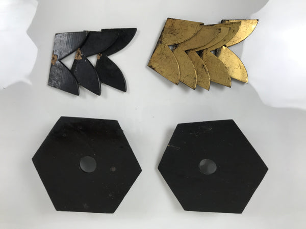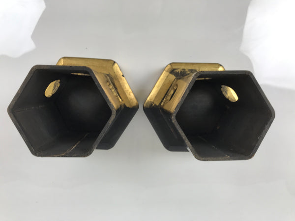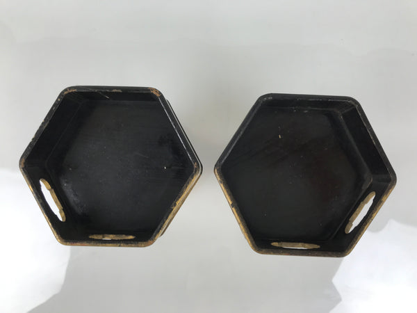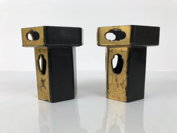 These are a pair of antique offering stands called Kuge for the Buddhist altar in Japan. Cut in a floral shape with a removable top piece resembling a flower, though the petals of the top piece come off from the stand, and some of them are missing. This pair is painted with gold and black lacquer. It is a utensil for offering rice cakes, fruits, Rakugan sweets, etc, and is mainly used by the Jodo Shinshu Honganji sect of Buddhism.  This pair is cased in a wooden box, and there is a handwritten sentence on the backside of the lid.