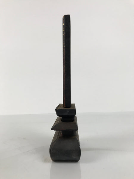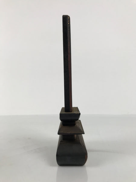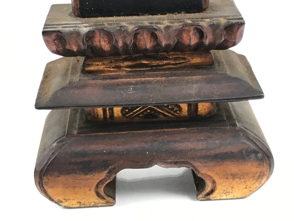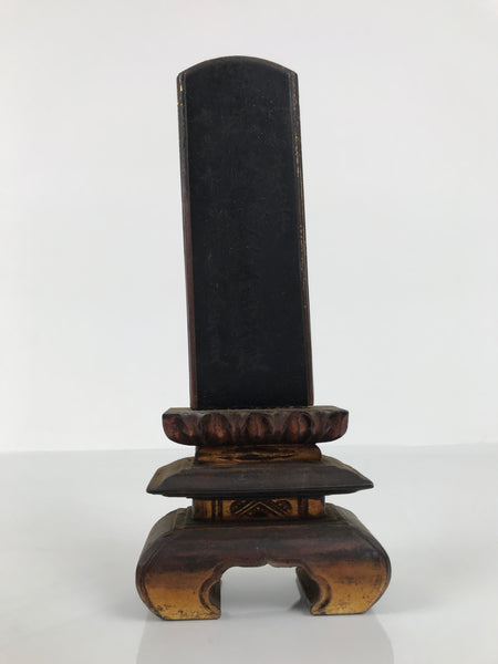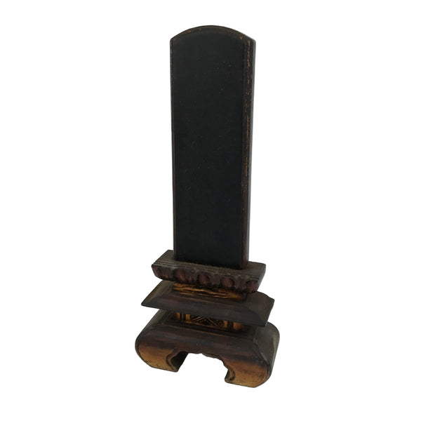 This is a vintage Japanese black lacquered wood ihai, or mortuary spiritual tablet. It features the Dharma name or kaimyo, a posthumous name given to dead people, on the front. The name is almost erased but still partially visible. This tablet was once embellished with gold foil, now tarnished.