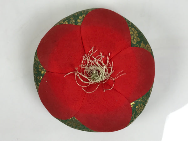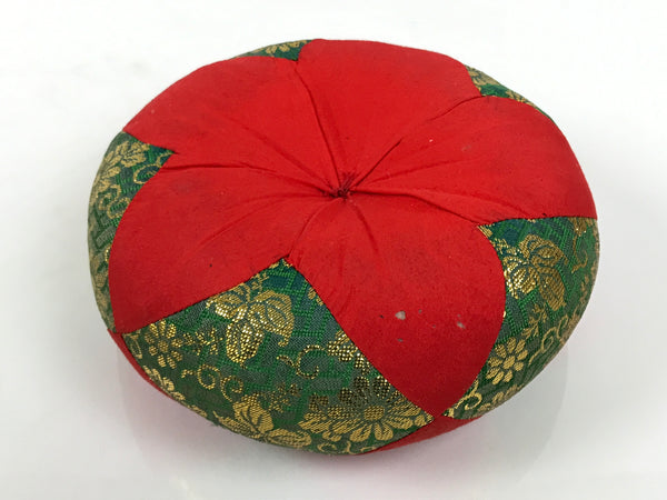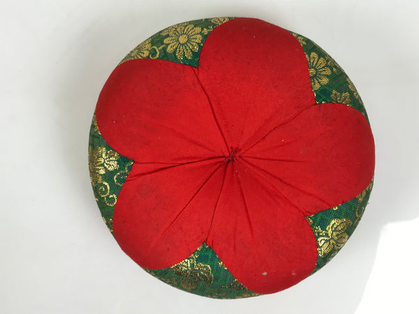 This is a vintage Japanese orin bell for Buddhist altars. It contains a plain brass bowl with a simple wooden striker. It rests on a platform-type pillow made of red and green fabric and gold chrysanthemum designs. Singing bowls are sounded during ritual prayer.