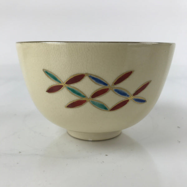 This is a vintage Japanese ceramic green tea bowl, or matcha chawan. It is mostly beige with a gold rim and a cloisonné-style illustrated design in red, green, and blue. This piece is kyo ware. It has a smooth texture. This bowl is signed with a stamped mark on the bottom. It is sturdy and easy to handle. This shape of this bowl is called wan-nari, which is a tea bowl resembling a typical soup or rice bowl with a straight edge lip.