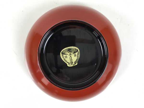 This is a vintage Japanese Wajima wooden lacquered rice bowl. It is mostly red with a black rim and bottom, made with natural lacquer. It is a beautifully handcrafted addition to any traditional Japanese dinnerware set.