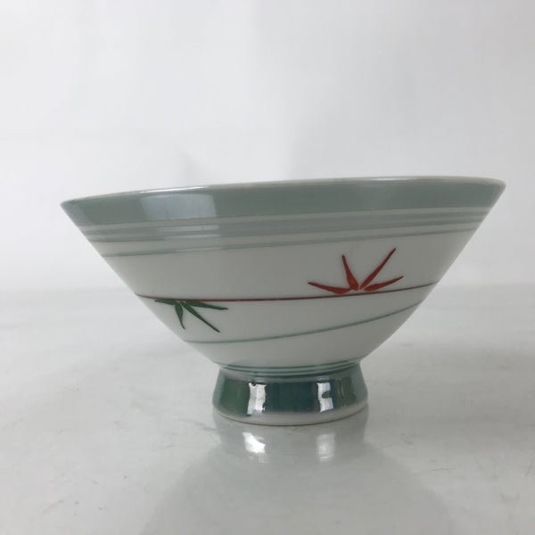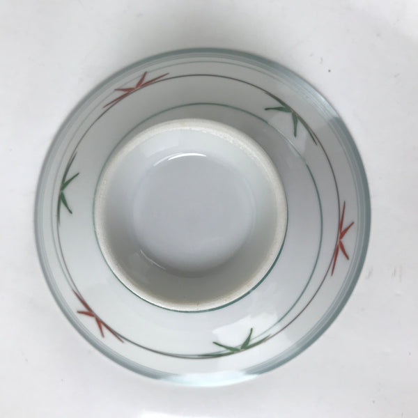 This item is a vintage Japanese porcelain rice bowl. The design on this wide-mouthed small bowl looks like bamboo leaves floating in a river stream. The top rim and the foot are painted with a glossy greenish-gray color. It can also be used for side dishes. Rice bowls are made to be lightweight and held in one hand (thumb on rim, other fingers on foot).