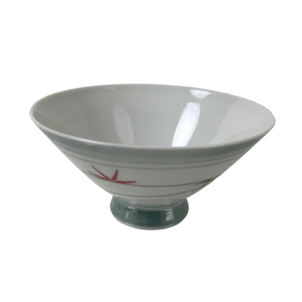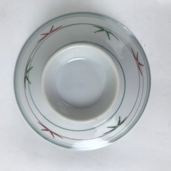 This item is a vintage Japanese porcelain rice bowl. The design on this wide-mouthed small bowl looks like bamboo leaves floating in a river stream. The top rim and the foot are painted with a glossy greenish-gray color. It can also be used for side dishes. Rice bowls are made to be lightweight and held in one hand (thumb on rim, other fingers on foot).