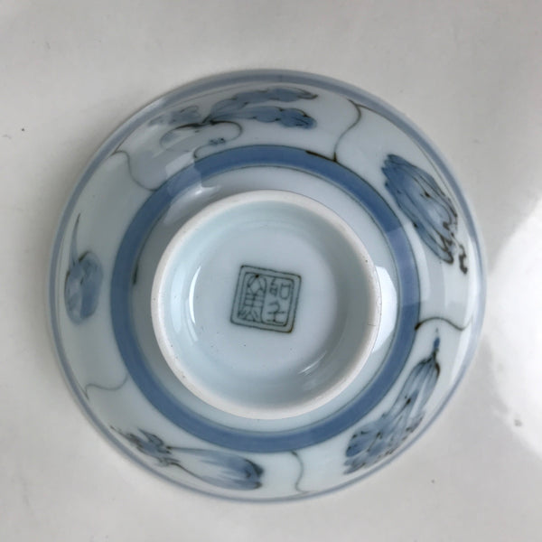 This item is a vintage Japanese porcelain rice bowl. This wide-mouthed small bowl is white with a blue painting, Sometsuke, depicting five kinds of vegetables. It can also be used for side dishes. Rice bowls are made to be lightweight and held in one hand (thumb on rim, other fingers on foot).