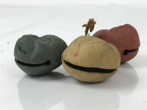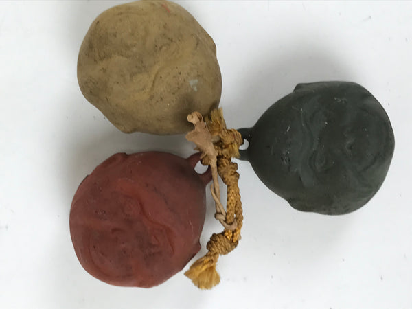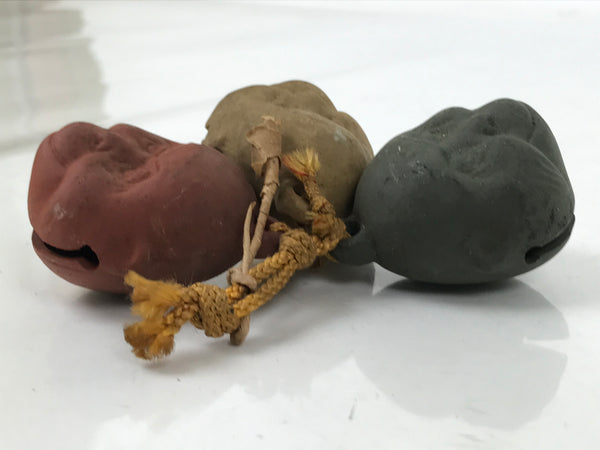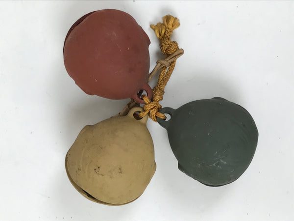 This is a set of vintage Japanese clay bells or dorei. Featuring three pieces representing monkeys, it symbolizes the Three Wise Monkeys. Each face has a unique color: reddish brown, dark green, mustard yellow. They all have a small clay ball inside and are attached by a braided yellow string tied at the top.